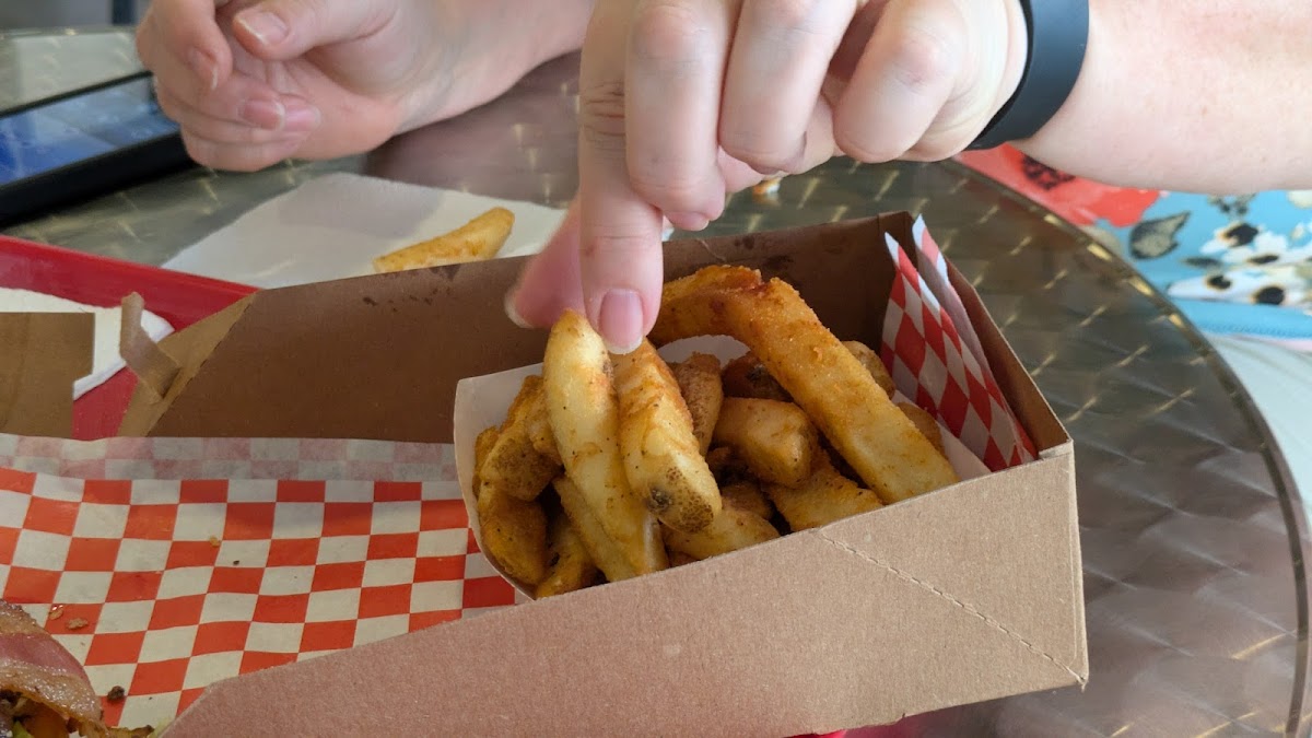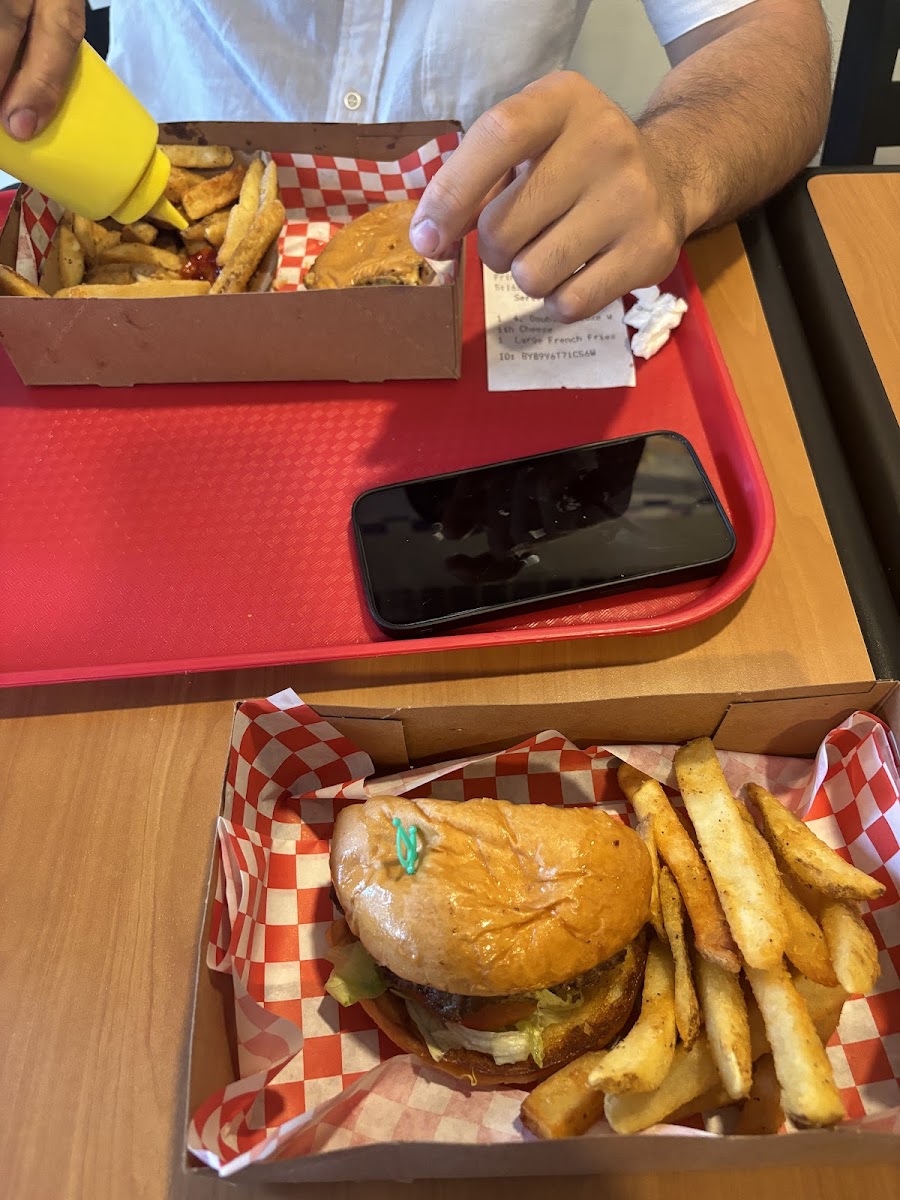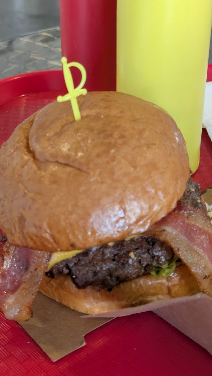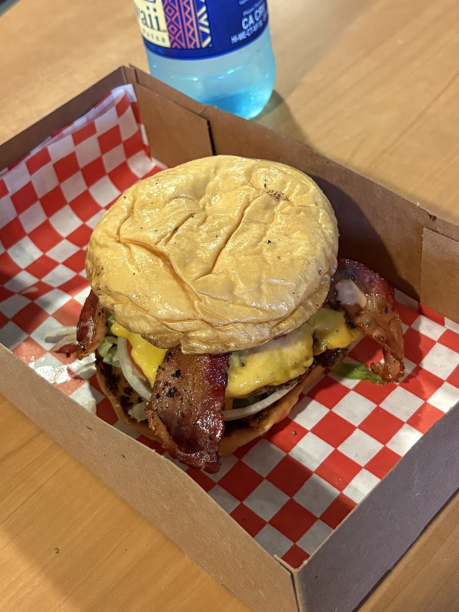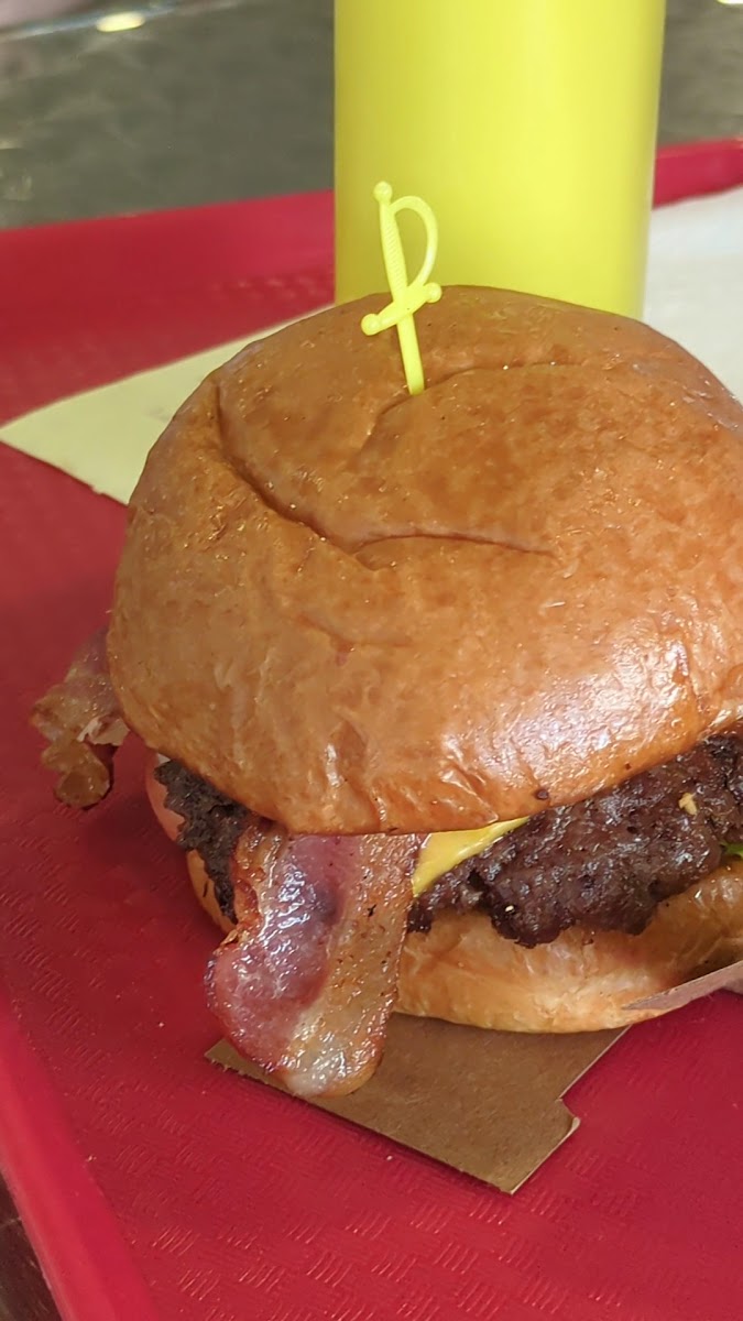 Stopped in for lunch and was seriously impressed. The burger came stacked with crispy bacon, melted cheese, and pickles that added just the right kick. The bun was buttery and soft with a perfect toast, holding everything together like a champ. Juicy patty, great flavor balance, and not overly greasy. The fries were thick cut and golden!! super satisfying. Plus the checkered paper tray gave it a classic burger joint feel. Definitely a spot I’d return to.