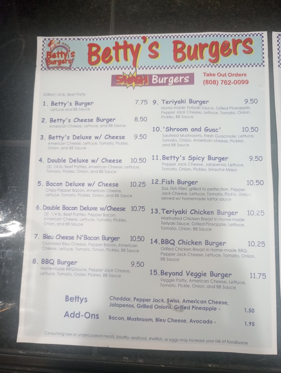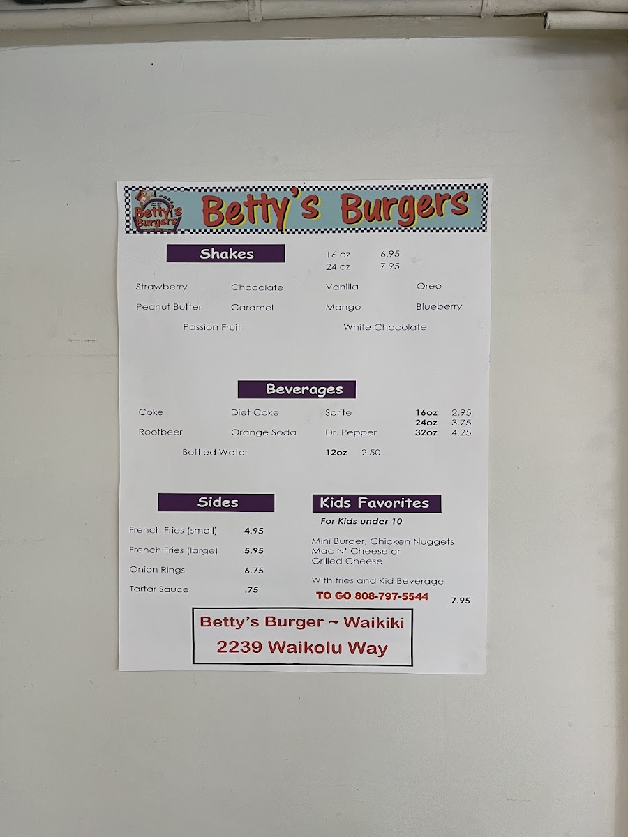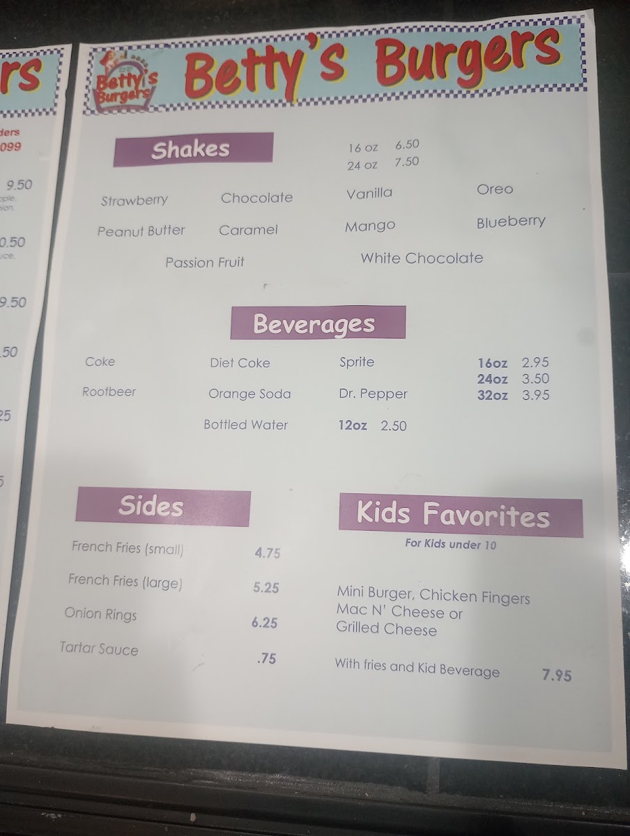 Betty’s Burgers offers a straightforward, approachable menu centered around classic American hamburgers and satisfying sides. The menu features a variety of tasty options including juicy beef patties, signature cheeseburgers, and specialty choices like the Blue Cheese N Bacon Burger or a Fish Burger. Alongside these, crispy, golden French fries and creamy shakes in flavors like Oreo, Passion Fruit, and Peanut Butter provide comforting, casual accompaniments.